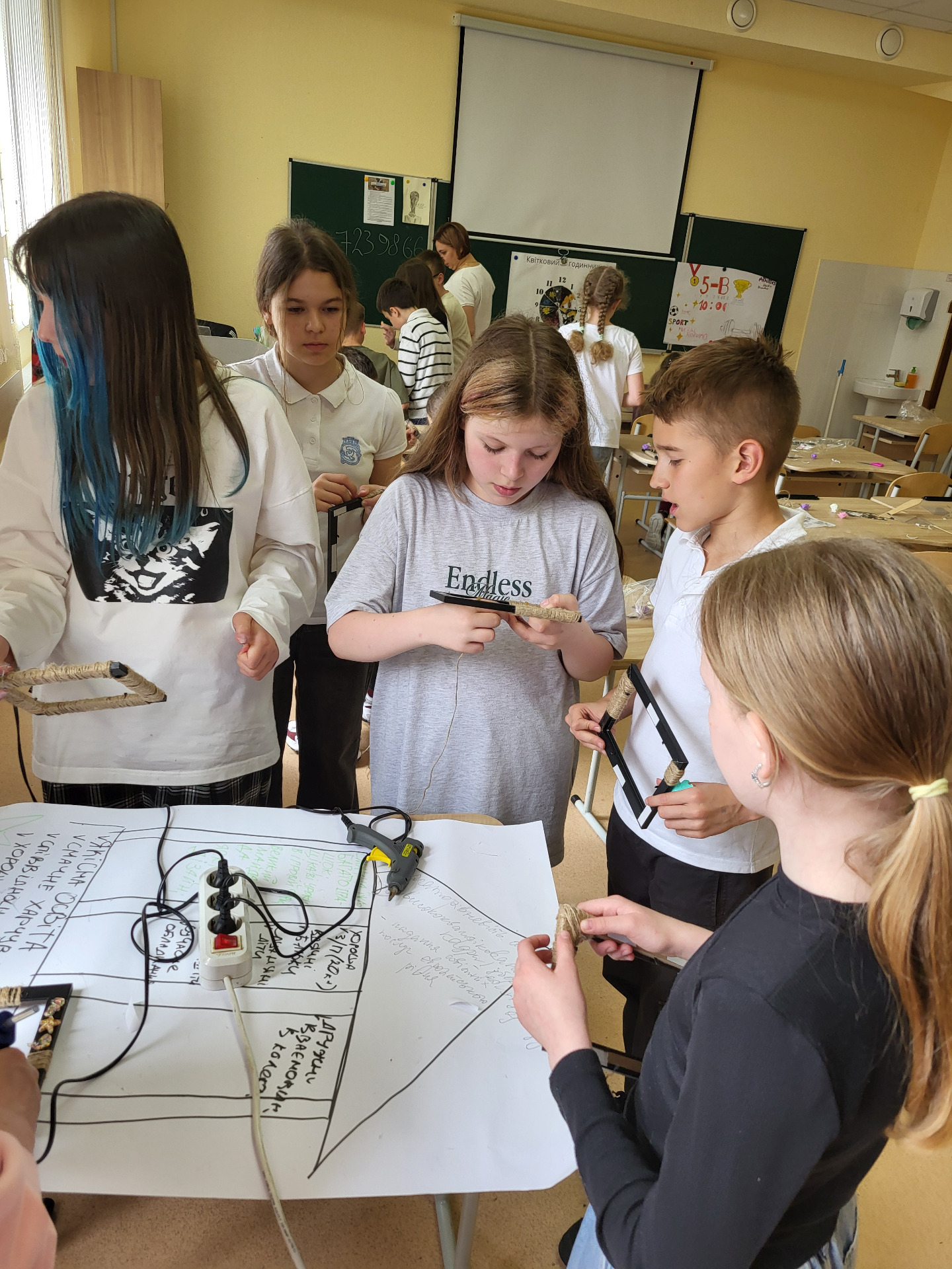 Використовуємо клей пістолет,підходить з 3 класу.